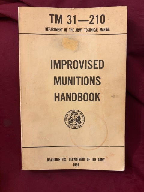 (anon). Improvised Munitions Handbook. TM 31-210. Photo available. Washington. Department of the Army. 1969. 256 pps. Octavo. Soft cover. First edition. Illustrated. Important reference work. Very scarce in this condition. Near fine copy (very light shelf wear).
