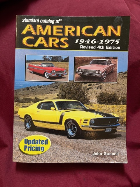 Gunnell, John. Standard Catalog of American Cars. 1946-1975. http://www.bookmine.com/images/239017.jpg Iola. Krause. 2002. 975 pps. Folio. Soft cover. Revised 4th edition. Illustrated. Important reference work. Very scarce in this condition. Fine copy (very light shelf wear).