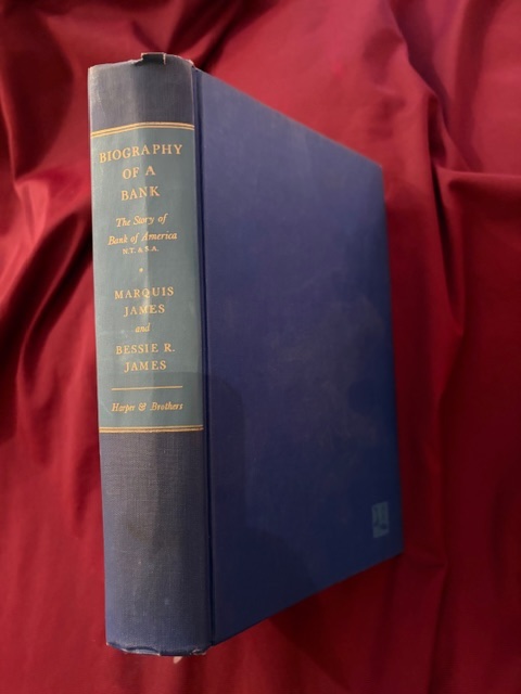 James, Marquis. Biography of a Bank. The Story of Bank of America. NT & SA. 1904-1953. Photo available. New York. Harper & Row. 1954. 566 pps. 4to. Gilt decorated hard cover. Stated first edition. Illustrated. Important reference work. Very scarce in this condition. Fine copy (very light shelf wear).