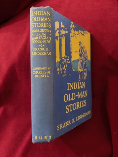 Linderman, Frank & Charles Russell. Indian Old-Man Stories. More Sparks From War Eagle's Lodge-fire. Photo available. New York. Blue Ribbon Books. c. 1920. 169 pps. 4to. Decorated hard cover. First edition thus. Reprint. Illustrated in black, white and color by Charles M. Russell. Very scarce in this condition. Near fine copy (child's name crossed out with crayon).