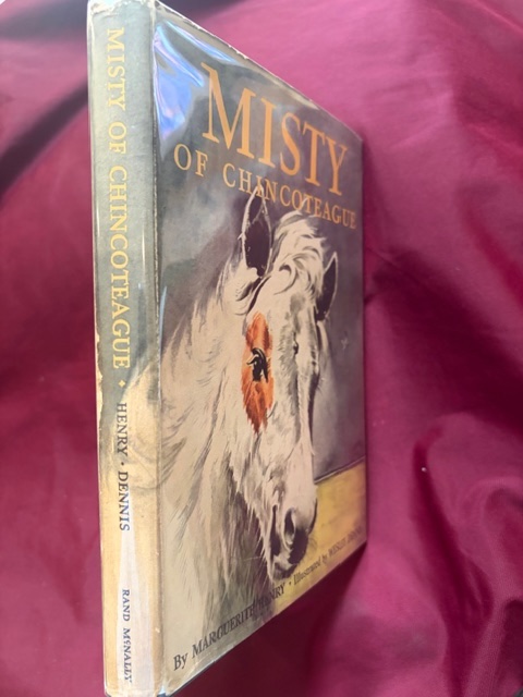 Henry, Marguerite. Misty of Chincoteague. Photo available. New York. Rand McNally. 1951. 175 pps. 4to. Gilt decorated hard cover. Early reprint. Illustrated in black, white and color by Wesley Dennis. Very scarce in this condition. Fine copy (inscription on end paper) in fine (price clipped) dust jacket (in mylar).