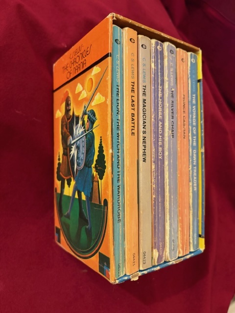 Lewis, C.S. The Chronicles of Narnia. 7 Volumes in box. Photo available. New York. Collier. c. 1977. Octavo. Soft covers. Reprints. Seven volumes. Very scarce in this condition. Near fine copies (light spine wear) in lightly edge worn box.