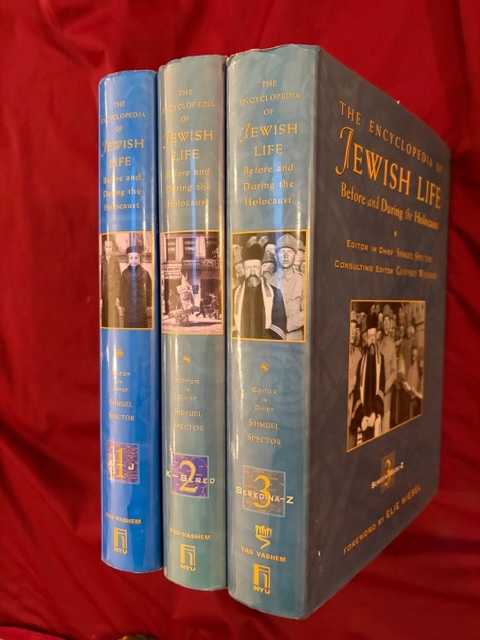 Spector, Shmuel & Elie Wiesel. The Encyclopedia of Jewish Life. 3 volumes. Before and During the Holocaust. Photo available. Washington Square. New York University Press. 2001. Folios. Gilt decorated hard covers. First editions. Three volumes. Illustrated. Important reference work. Very scarce in this condition. Fine set in fine (slightly different colors) dust jackets (in mylar).