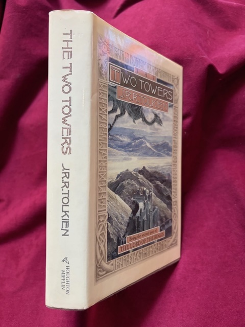 Tolkien, J.R.R. The Two Towers. http://www.bookmine.com/images/239015.jpg Boston. Houghton Mifflin. 1982. 352 pps. 4to. Gilt decorated hard cover. Early reprint. Very scarce in this condition. Large, folding map in rear. Fine copy (blank bookplate) in fine dust jacket (in mylar).