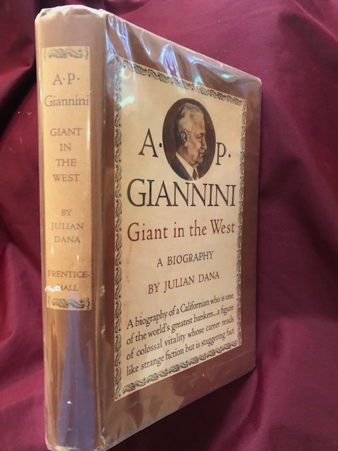 | Dana, Julian. A.P. Giannini. Giant of the West. A Biography. Photo available. New York. Prentice Hall. 1947. 345 pps. Octavo. Decorated hard cover. First edition. Important reference work. Very scarce in this condition. Fine copy in near fine (very light shelf wear) dust jacket (in mylar). Book ID: 237450 |